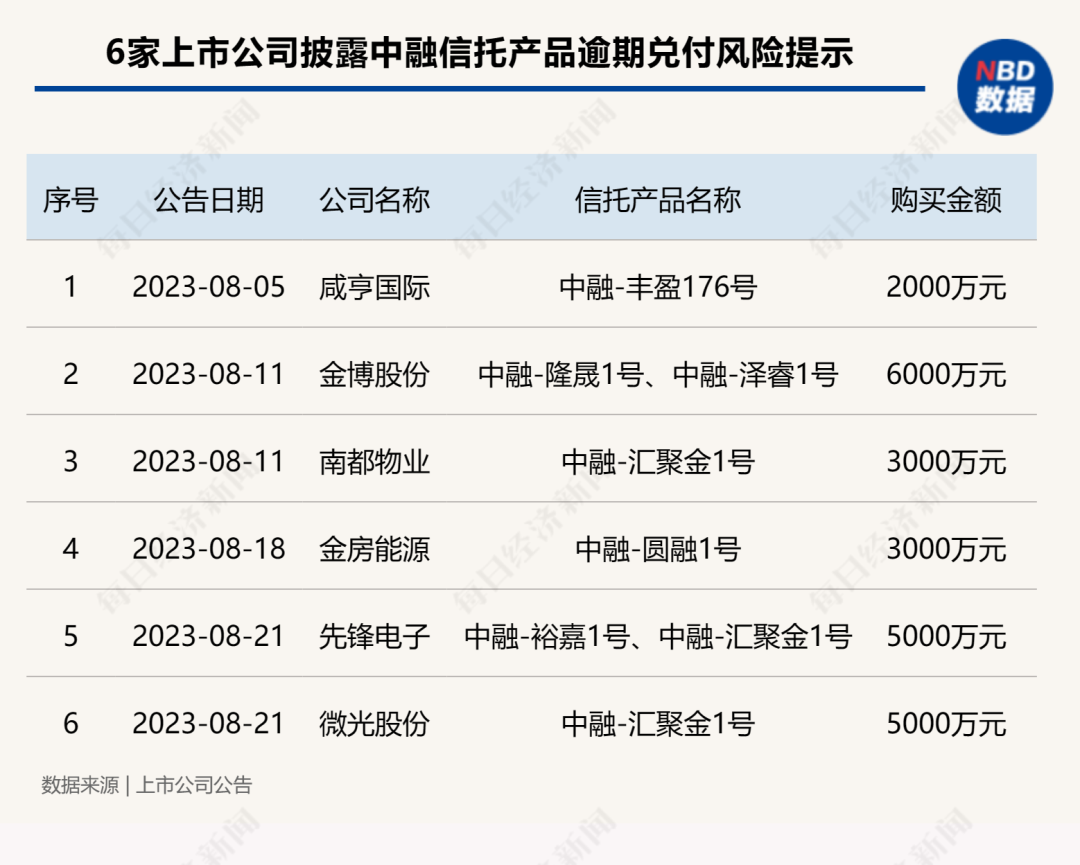 8月21日晚,微光股份(22.900, 0.02, 0.09%)(SZ002801)公告,公司购买的5000万元“中融-汇聚金1号”信托产品出现逾期兑付问题;先锋电子(14.360, -0.04, -0.28%)(SZ002767)购买的5000万元中融信托产品也出现逾期兑付问题。